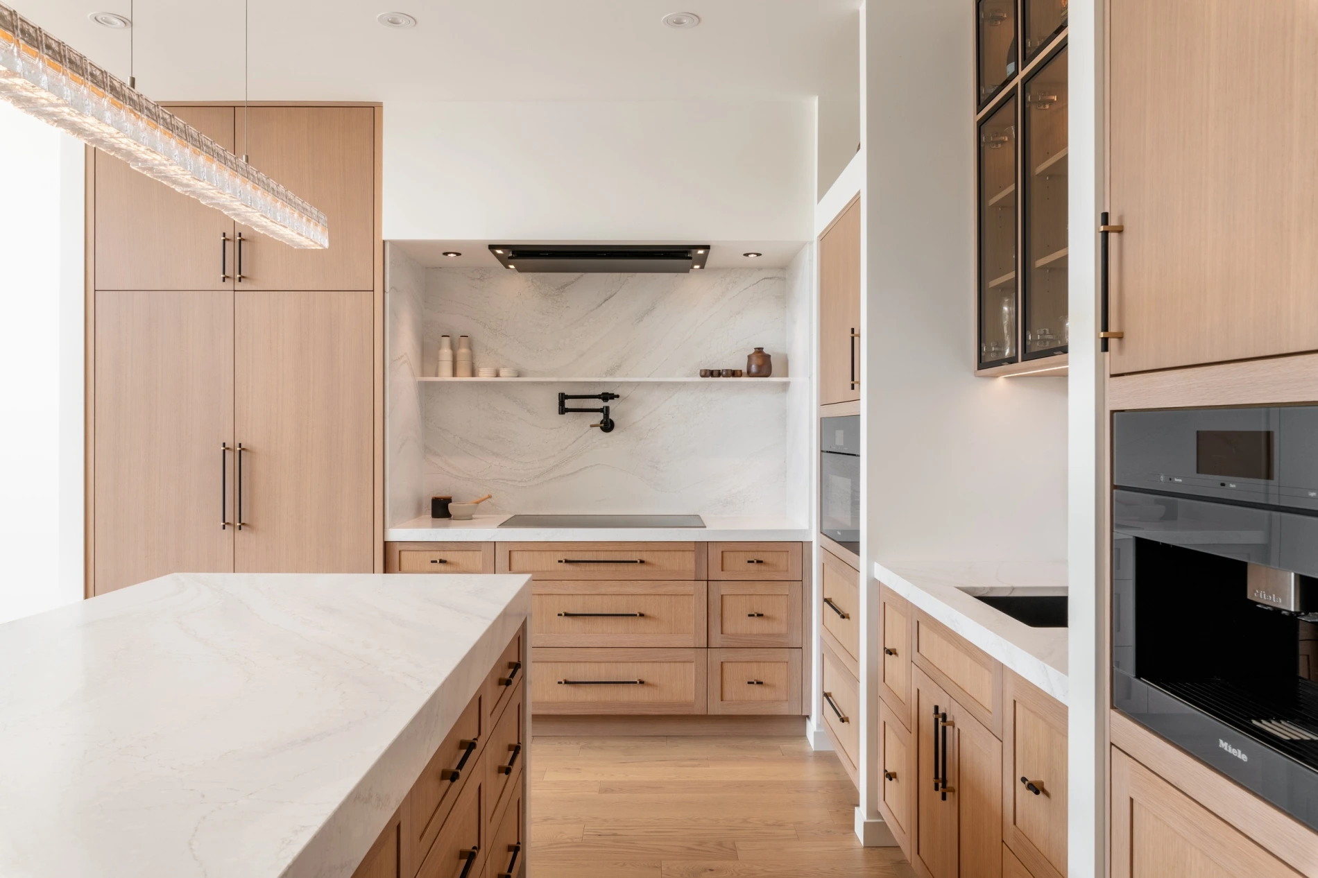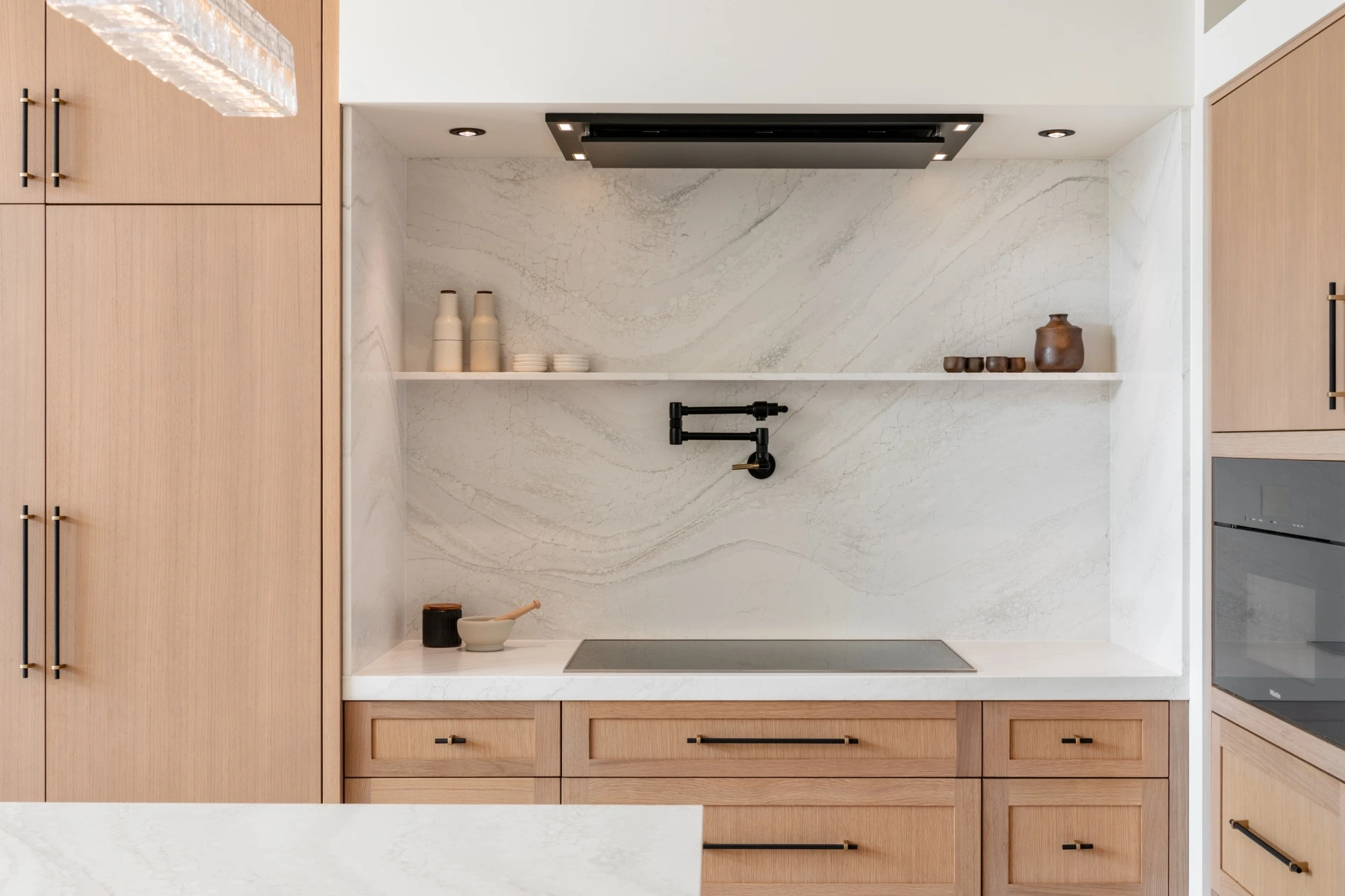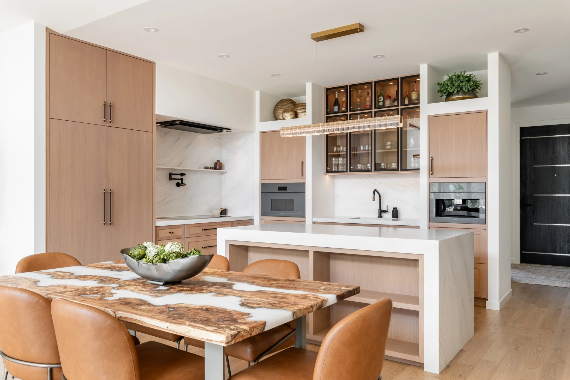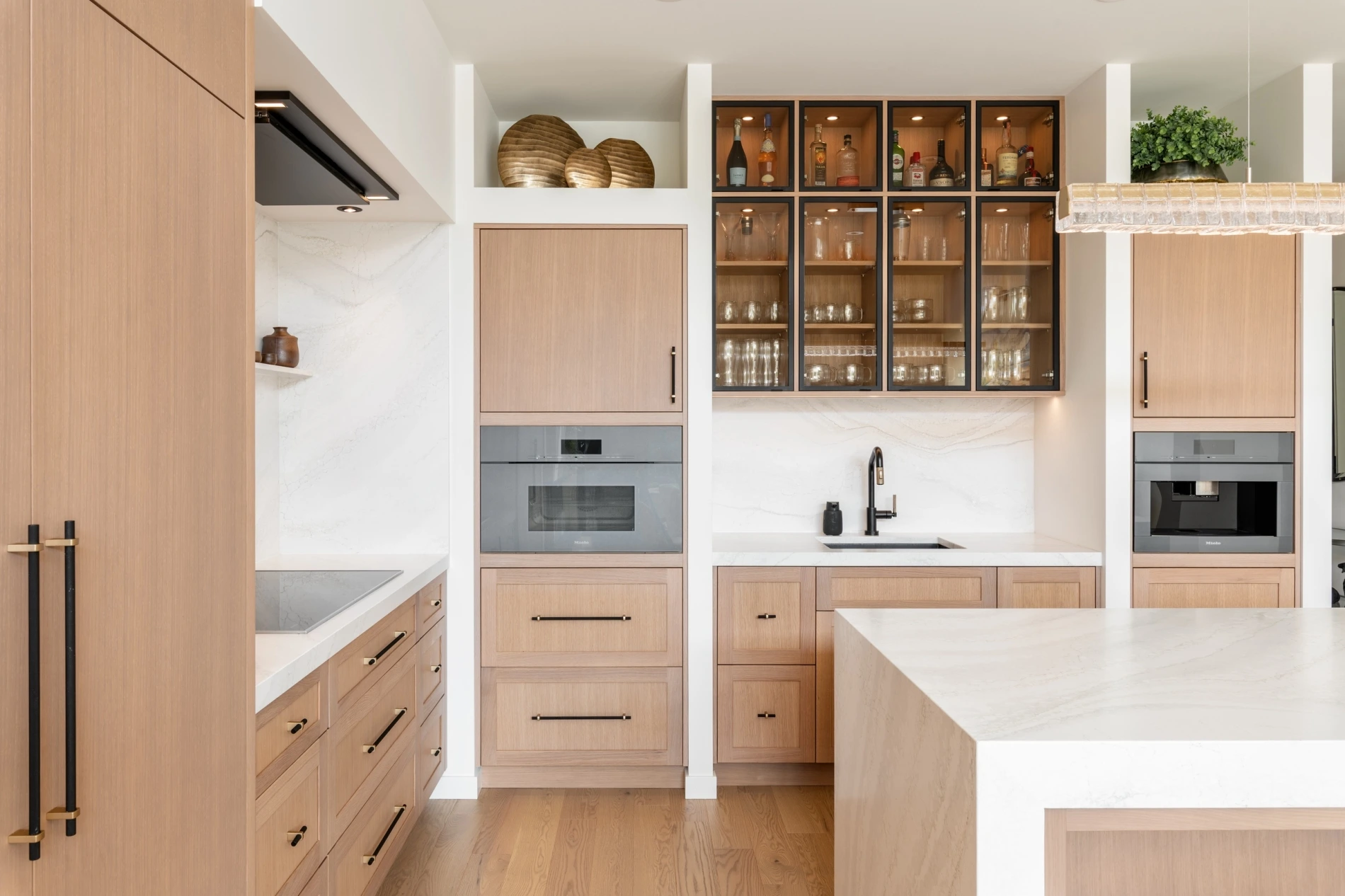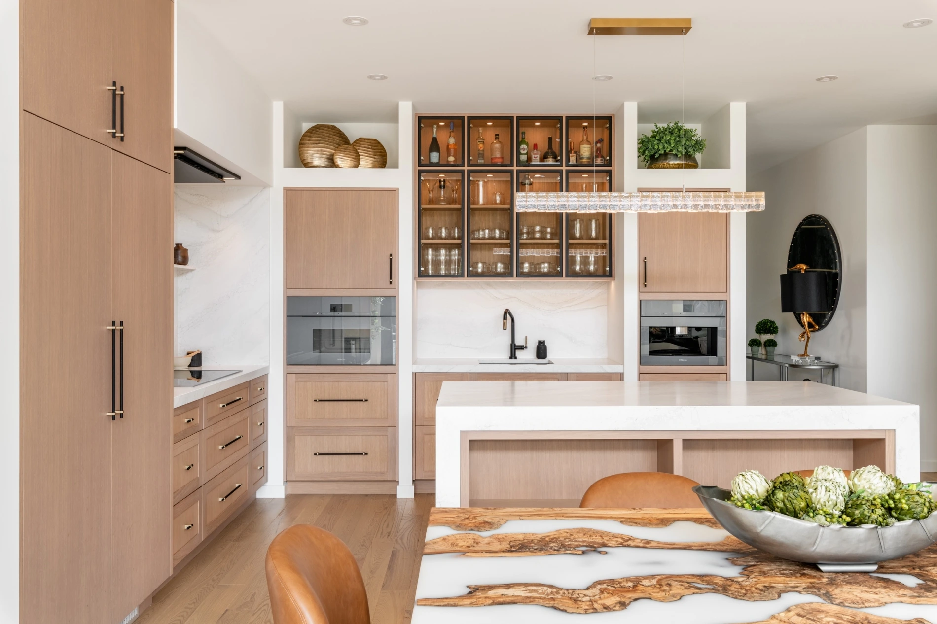 - Striking kitchen with waterfall-edge quartz island and timber-framed pantry opening.
