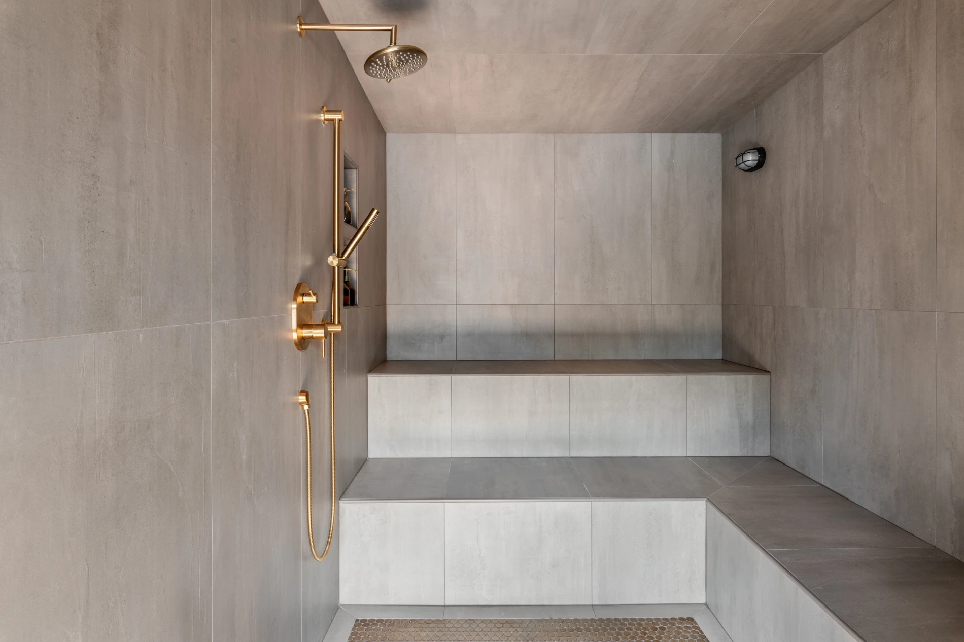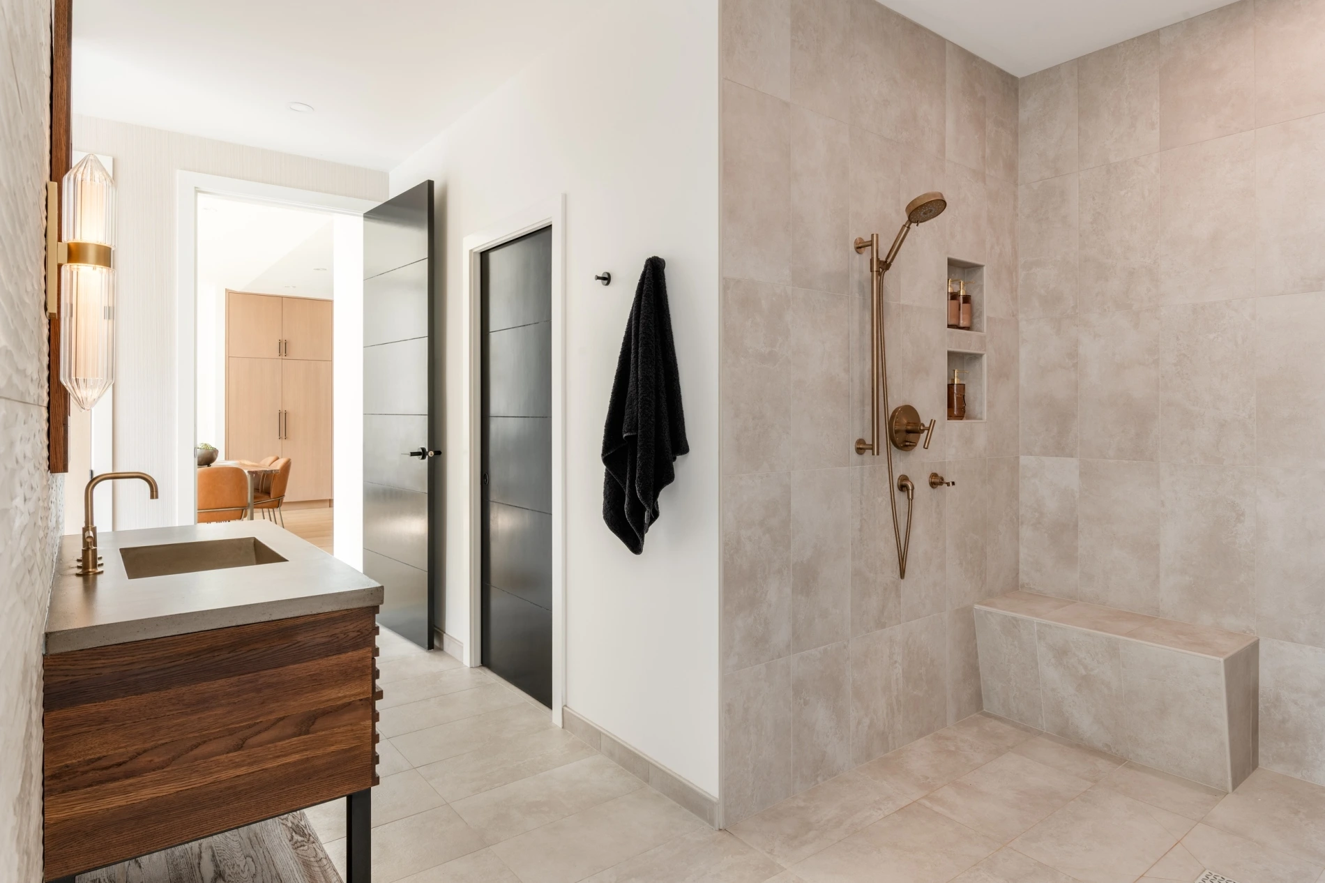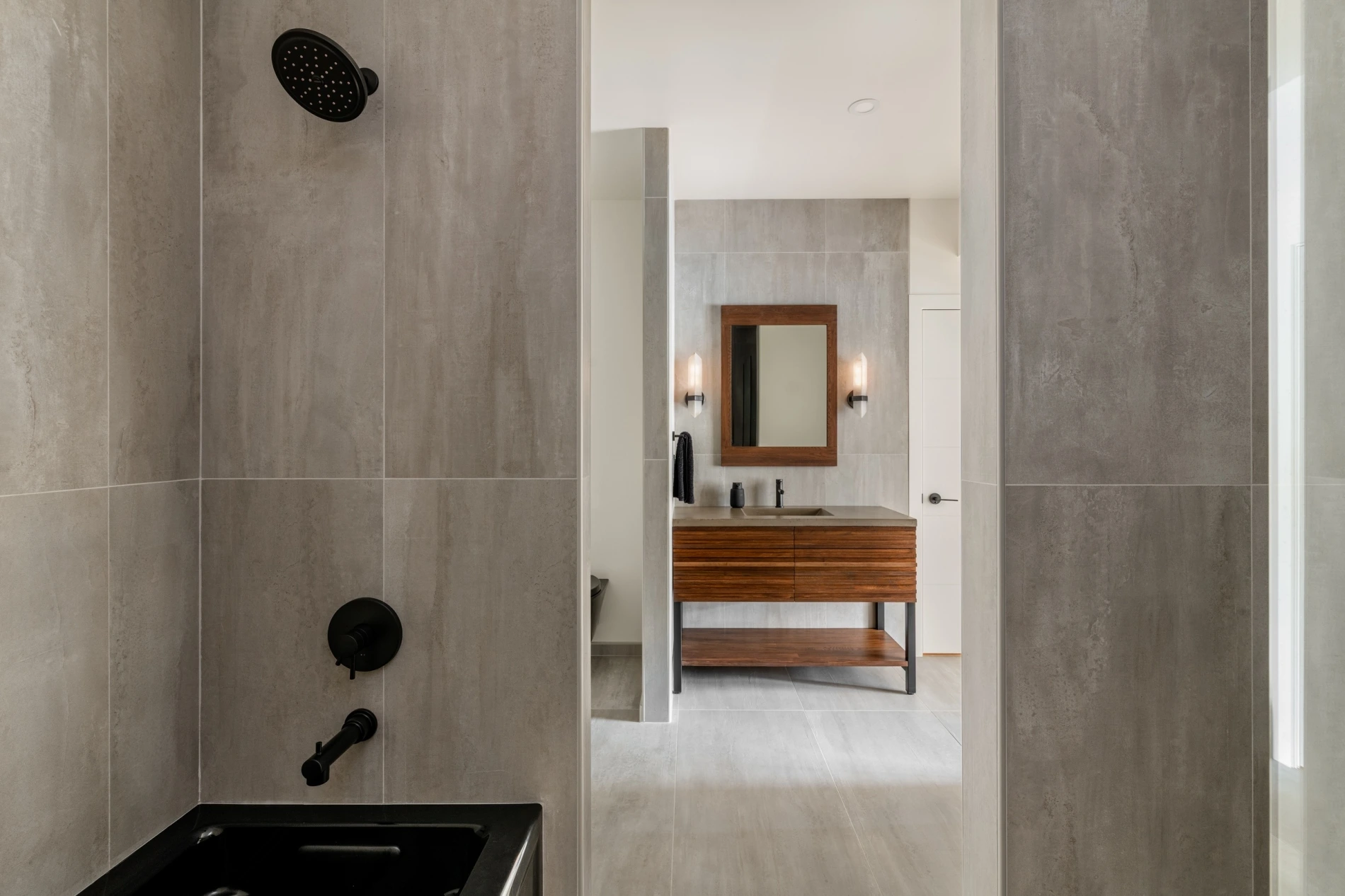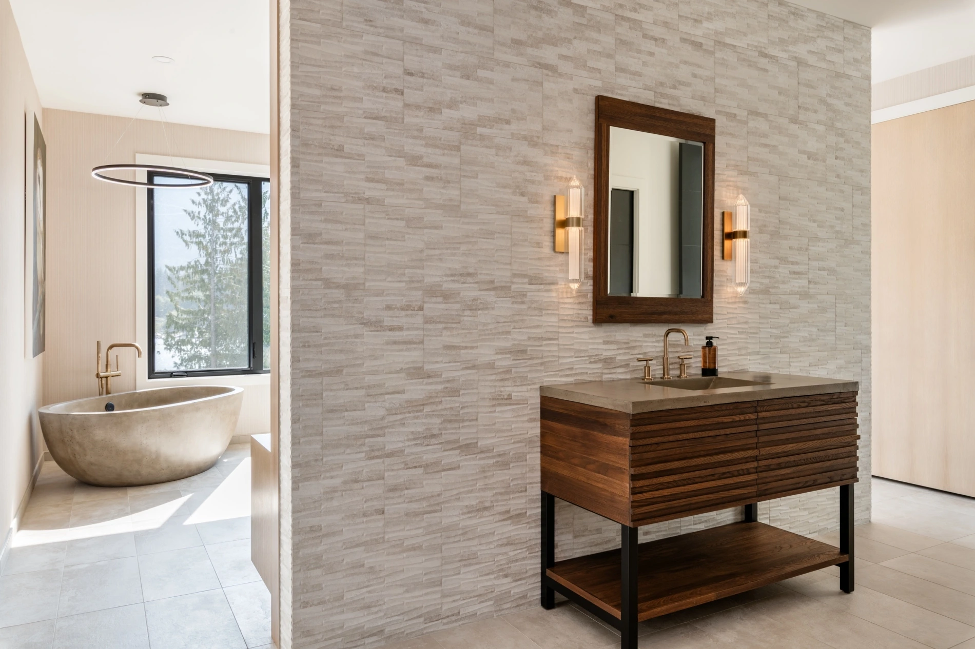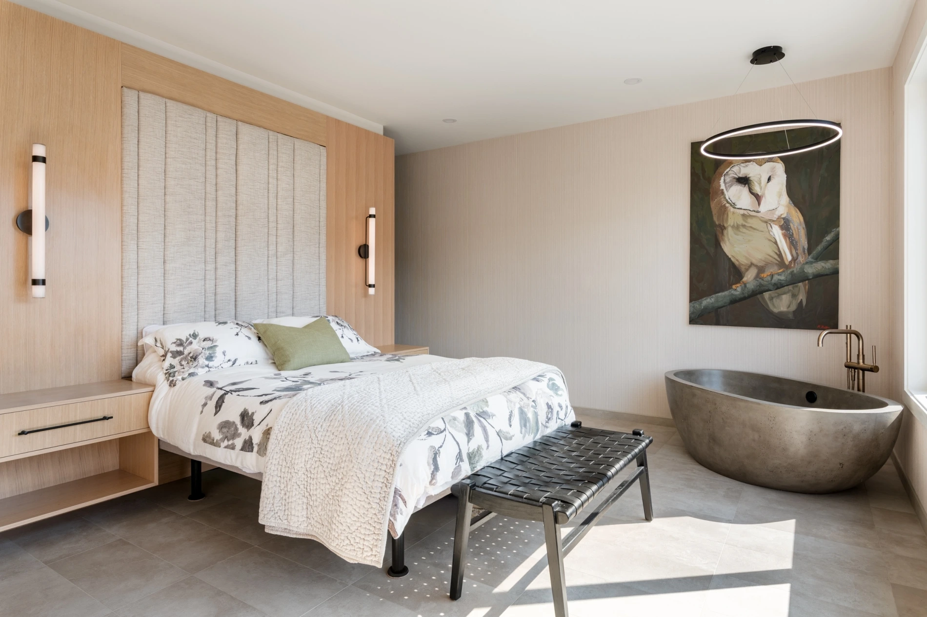 - Concrete tub and a Roman shower in the primary suite.
