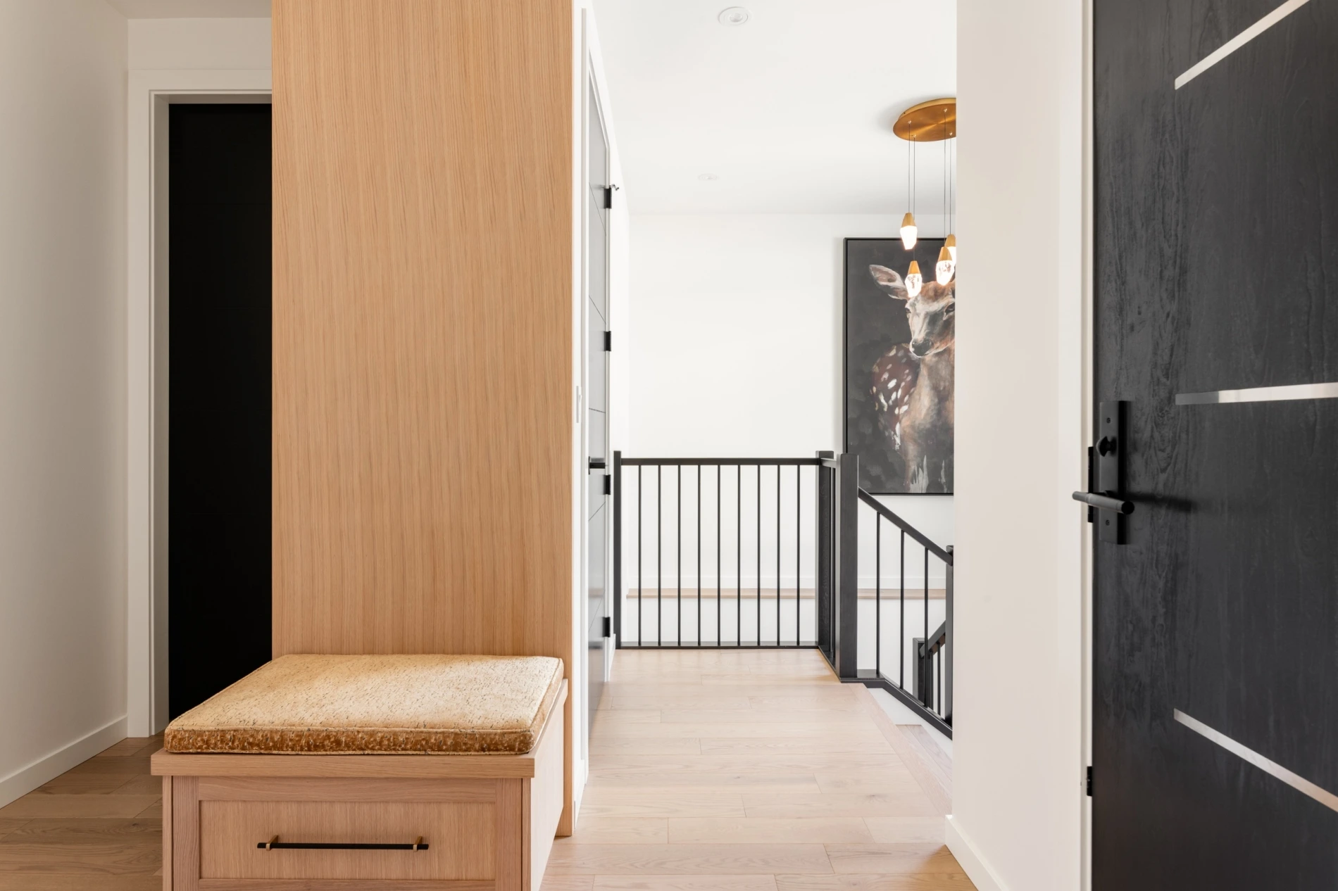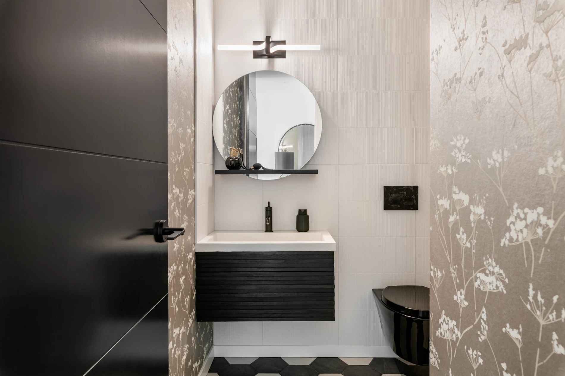 - Painted black 8' interior doors and curated wallpaper feature in the powder room.