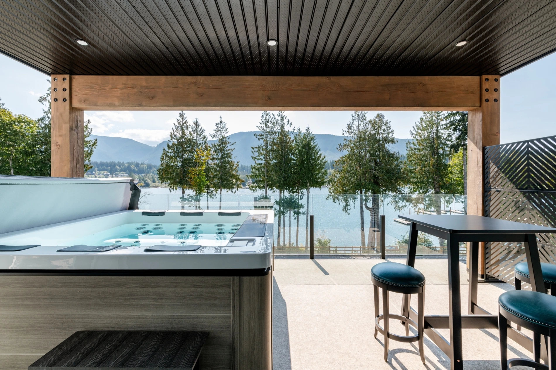 - Big deck timbers, angled timber entry, and minimalist deck railings with no top rail.