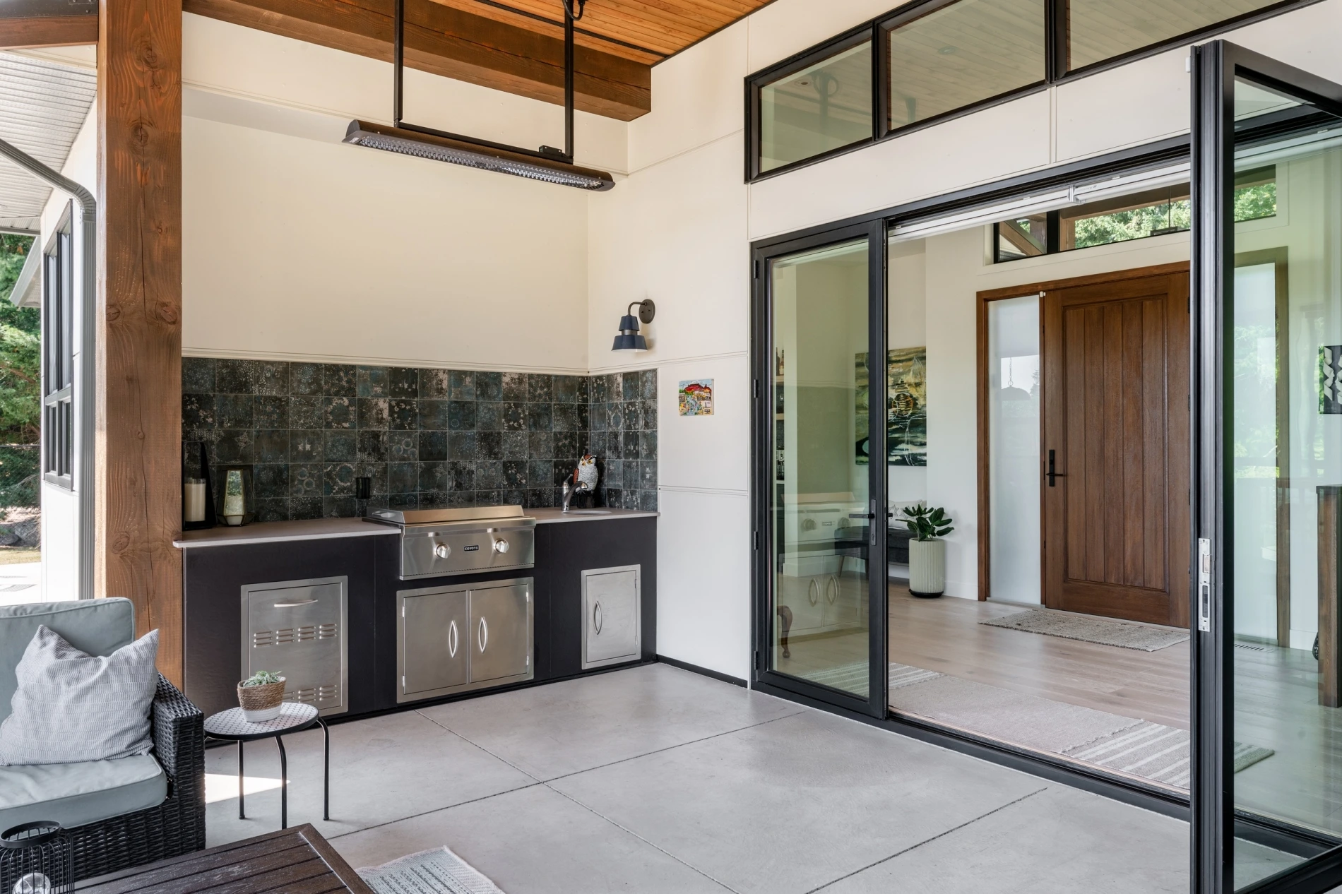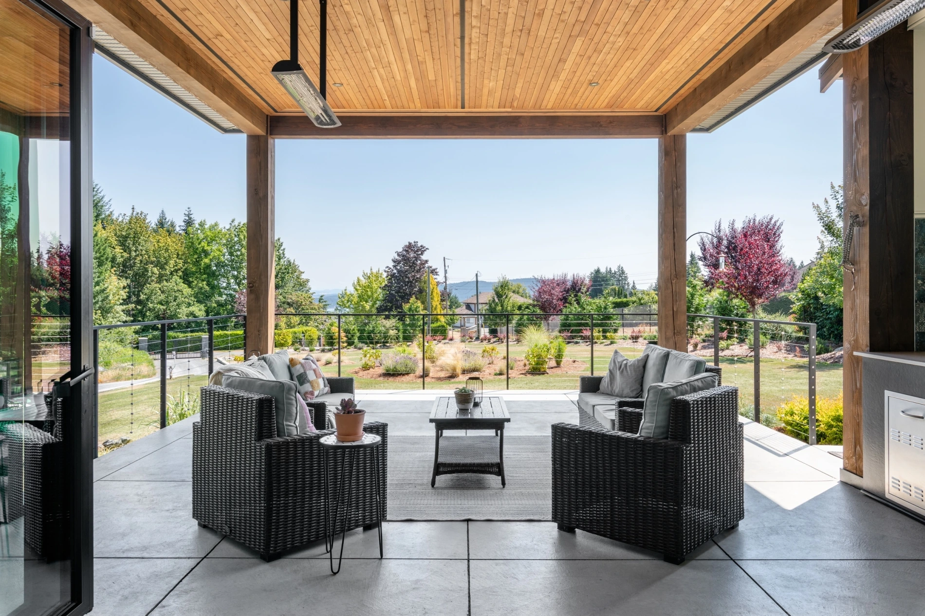 - Fully outfitted outdoor kitchen and a concrete-topped deck with wood soffit.