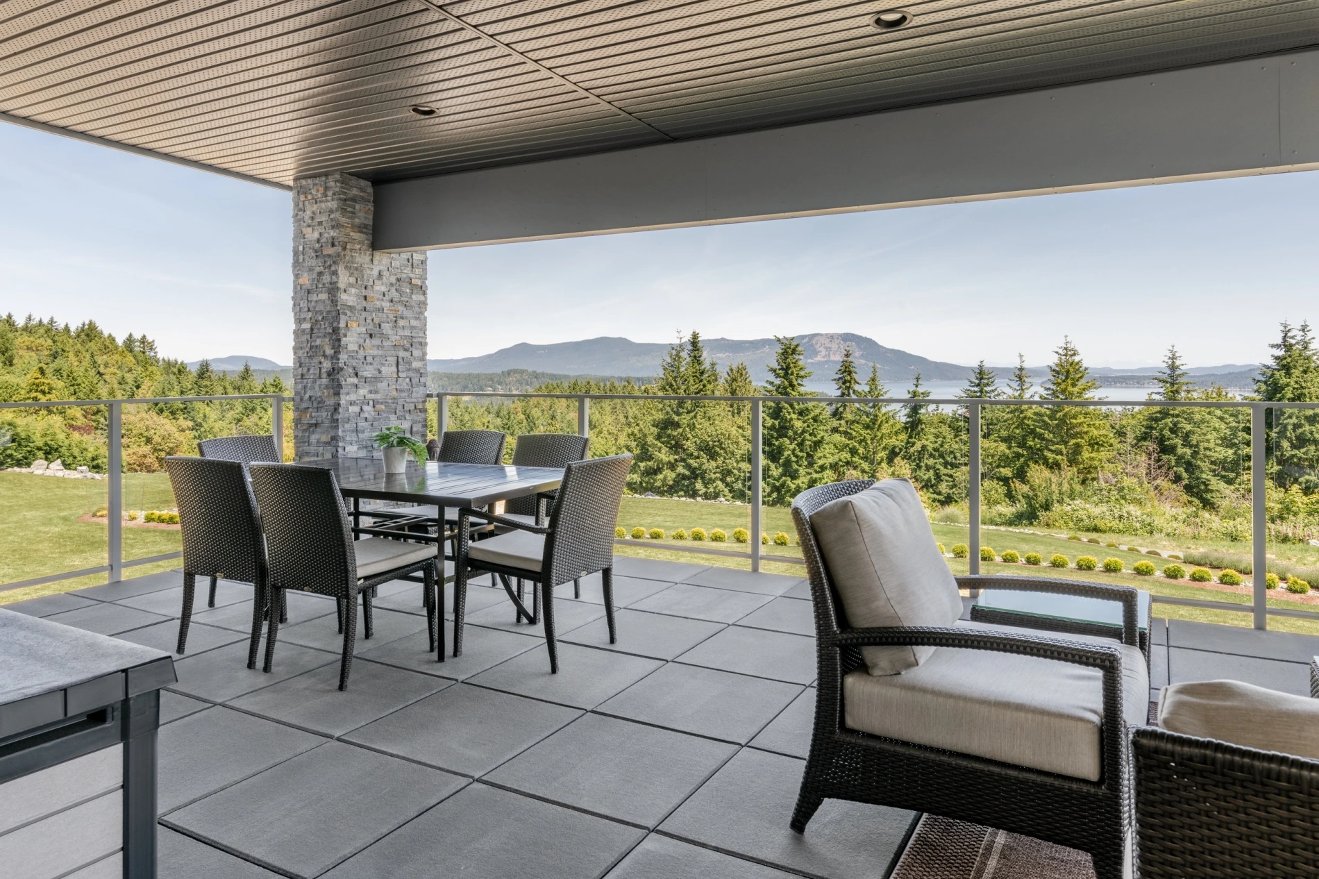 - Large covered deck with a panoramic outlook and a paver-style concrete surface.